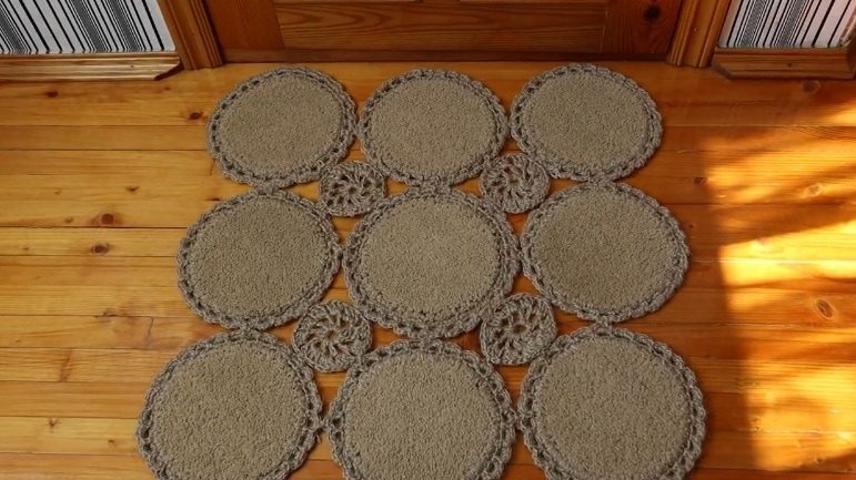С помощью тарелки на обратной стороне ковра нарисуйте круги. Вырежьте круглые заготовки ножницами, или ножом, если ковер слишком толстый.