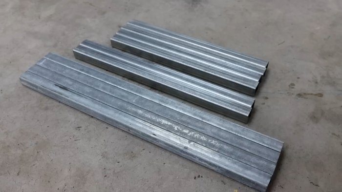Разрезаем профильную квадратную трубу на 4 отрезка по 45 см, на 2 – по 35 см и на 4 – по 30 см. На четырех отрезках по 45 см отмеряем от конца 30 см и проводим поперечные линии. С другого конца этих отрезков и на четырех отрезках по 30 см откладываем от края 1 см и также проводим по поверхностям всех отрезков поперечные линии.