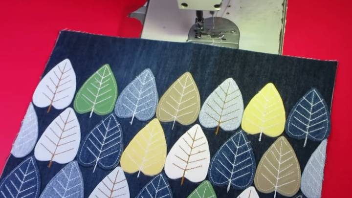 Джинсовые штанины разрежьте на две детали 35*35 см. Отмерьте одинаковые поля мылом на джинсах 7,5 см шириной и разложите листочки в ряд. Прошейте по контуру на машинке.