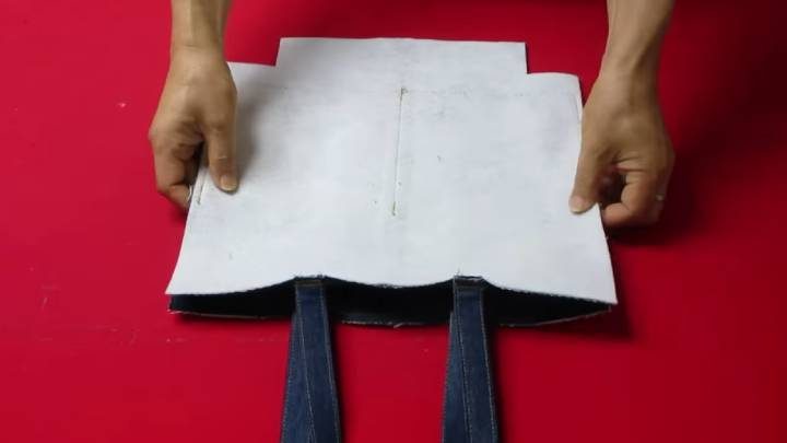 У двух половинок вырежьте углы 5 см. Вшейте ручки из тех же джинсов.