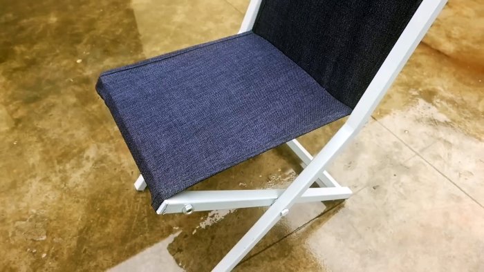 Когда стул разложен, ткань, натягиваясь, выполняет функции сидения и спинки, а также придает ему устойчивость. При складывании каркаса стула ткань не мешает этому, т. к. ее натяжение спадает.