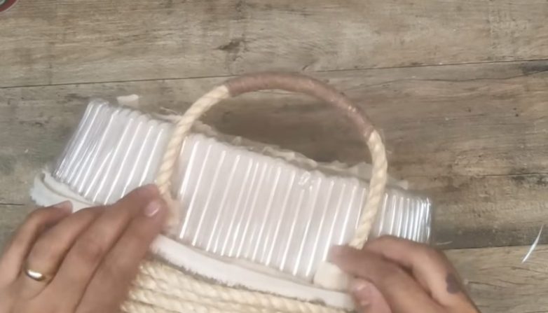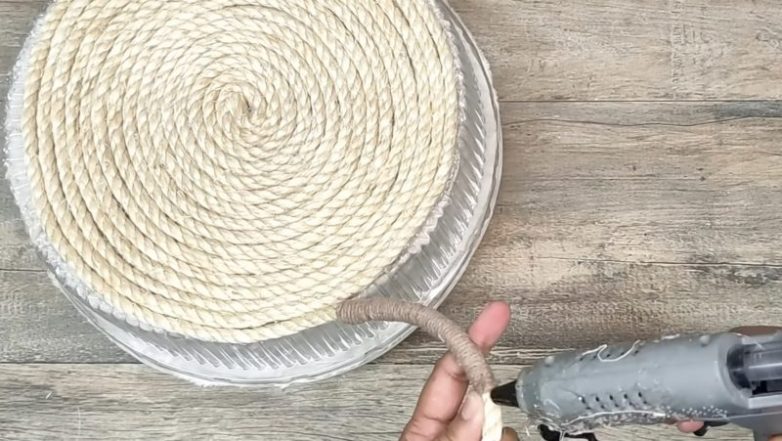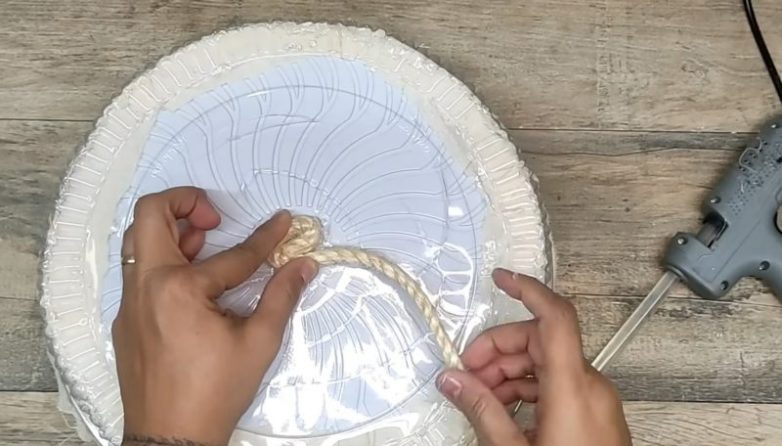 Оформите дно корзины толстым шнуром, фиксируя витки на горячий клей.