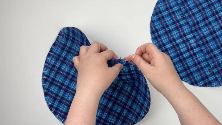 Через каждые 2 см по краю сделайте насечки. Соберите ткань, заколите булавками. Прошейте на машинке по кругу.