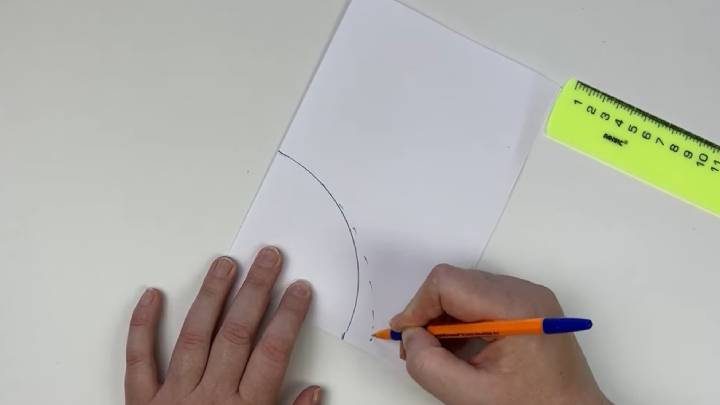 Теперь построим козырёк. На уголке бумаги слева и справа отмечаем 9 см, рисуем дугу. Отступаем вниз 1,5 см, рисуем линию.