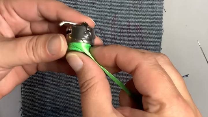 Затем установите, как обычно, в машинку. Подтяните нижнюю нить (ленту) вверх, как обычную нитку.
