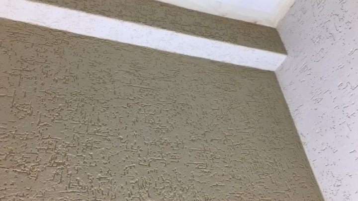 Теперь нужно взять цементную декоративную штукатурку. Разводим по инструкции сухую смесь водой и наносим на стены. Штукатурной гладилкой разравниваем и делаем крестообразный рисунок (разглаживаем то горизонтально, то вертикально). Можно сделать и только вертикальный, только горизонтальный или даже круговой рисунок, на ваш вкус.