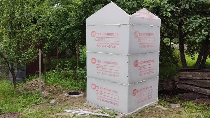 На монтажную пену собрать стенки + основание крыши туалета из экструзионного пенополистирола.