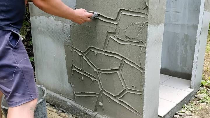 Теперь настала очередь декоративной штукатурки. Следует нанести её одним слоем и нарисовать узор (например, под камень) любым удобным инструментом.