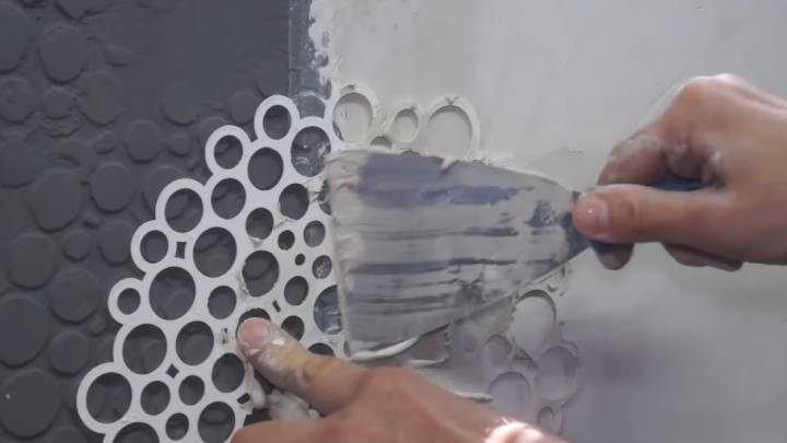 Разведите стартовую гипсовую шпаклёвку и через подставку, как трафарет, нанесите узор.