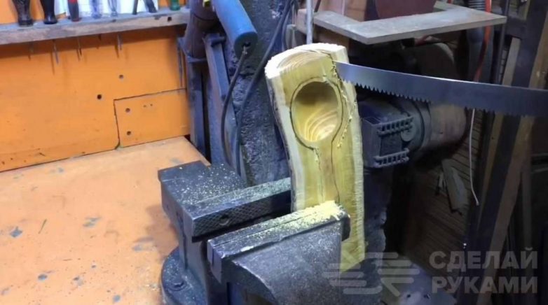 Потом все очень просто: при помощи данного приспособления делается углубление. Далее при помощи ручной ножовки надо вырезать саму ложку вместе с ручкой.