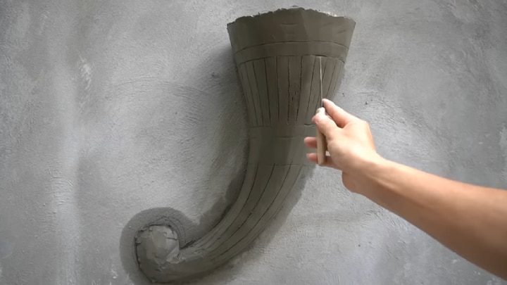 Вокруг вазы также можно добавить декор. Для этого добавьте раствор на стену, нарисуйте узор и удалите излишки цемента.