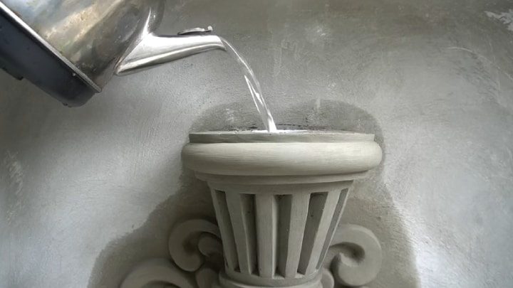 После полного высыхания и затвердевания цемента (1-3 суток) вазу можно прогрунтовать, покрасить и залакировать. А в пластиковое ведёрко налить воду.