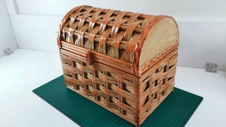 По бокам украсьте косичкой из тех же трубочек. Приклейте ручку, свёрнутую из бумаги. Покрасьте всё краской или морилкой. Нанесите лак для надёжности.