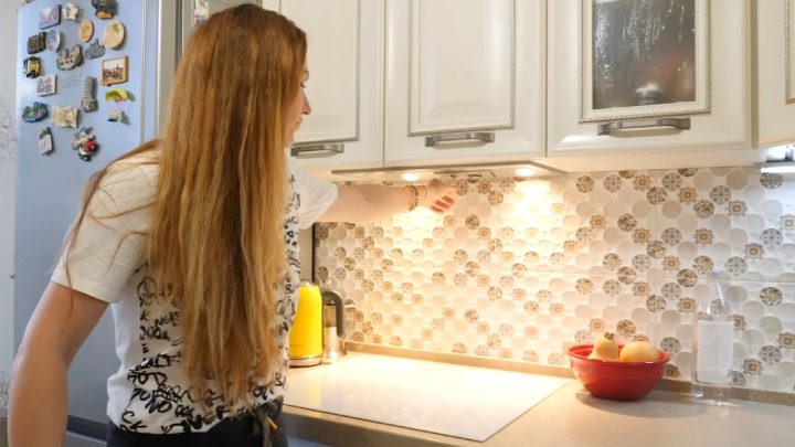 Над плитой имеется вытяжка, но она скрыта прямо в кухонном шкафу! Разумное и практичное решение.