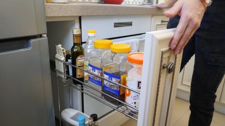 Здесь же, на этих 17 см располагается выдвижная узкая полка, где хранятся специи и масло.