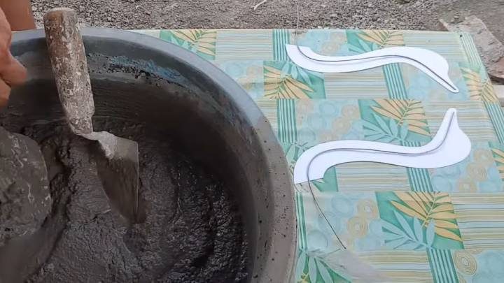 Цемент смешайте с песком 1:2, разведите густой раствор. Из бумаги вырежьте форму шеи и головы лебедя. Согните проволоку такой же формы.