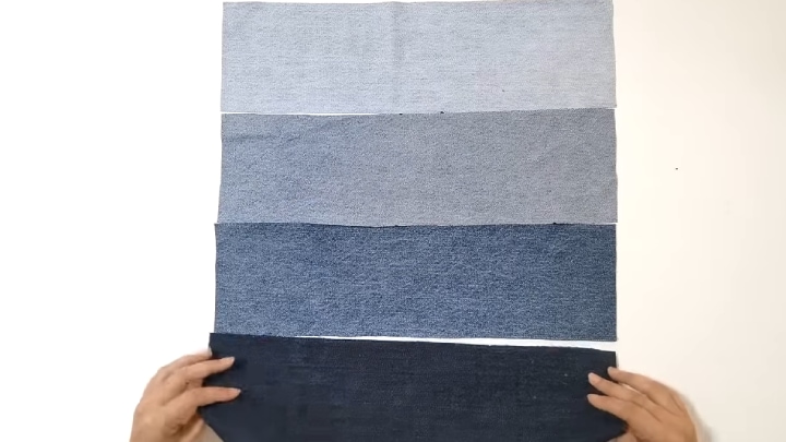 Нарежьте джинсы на 8 полос 42*12 см. Сшейте по 4 полосы между собой, шов — 0,7 см. Получится две одинаковые заготовки, каждая из 4 полос. К обратной стороне приклеить утюгом клеевой флизелин.