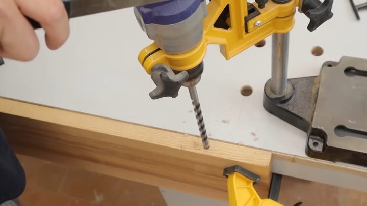 Под них также делаем отверстия. Устанавливаем врезные мебельные втулки и прижимные винты.