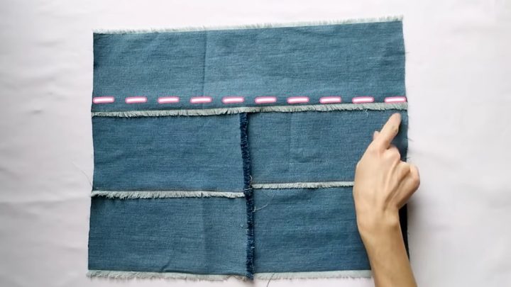Теперь приступаем к задней стороне. У нас осталась одна длинная полоса и 4 коротких. Так и должно быть. Сзади на юбке будет красивый разрез. По линиям, как на фото ниже, распустите джинсовую ткань, чтобы была бахрома.