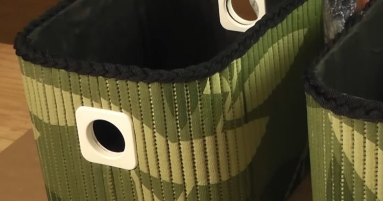 Отметьте на заготовке место, где будут располагаться ручки корзины. Вырежьте отверстия необходимого размера. Внутреннюю часть корзины также обклейте тонким нетканым материалом.