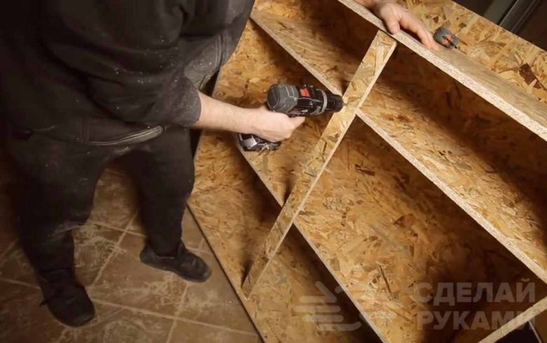 На следующем этапе работ мастер устанавливает заднюю стенку шкафа. Вырезать лист OSB нужного размера можно сразу или по месту, после того, как прикрутили его саморезами.