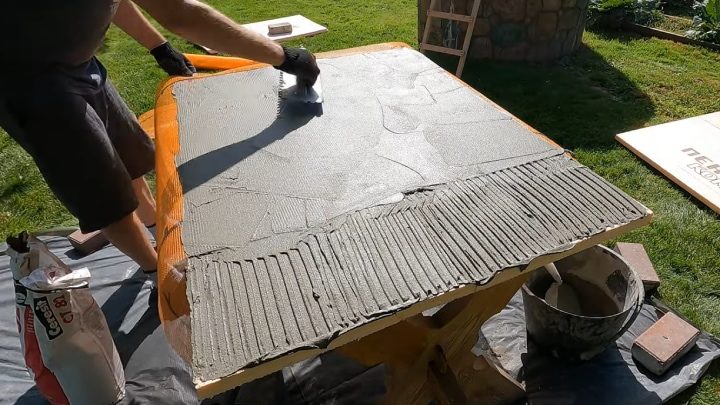 Для создания декоративной стороны разведите и нанесите плиточный клей. После схватывания разметьте брусчатку по краям.