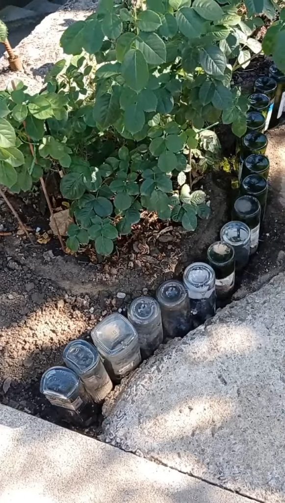 Выкопайте канаву вокруг клумбы, хорошенько пролейте водой. Вставьте стеклянные бутылки горлышком вниз.