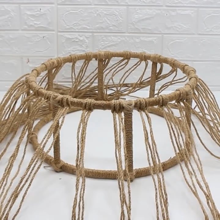 Обруч или деревянное кольцо диаметром 34 см обернуть джутом. К нему прикрепить на равном расстоянии 8 палок/труб ПВХ, также обернутых джутом. Сверху прикрепить ещё одно кольцо.