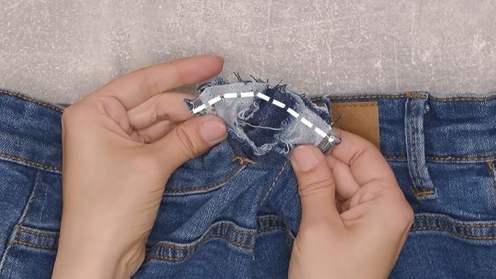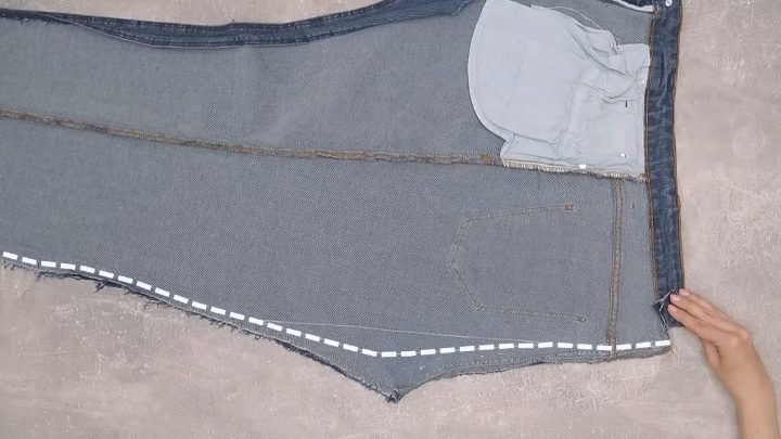 Джинсы распорите по швам спереди и сзади. Боковые швы и молнию оставьте нетронутыми. Сзади разрежьте пояс по центру.