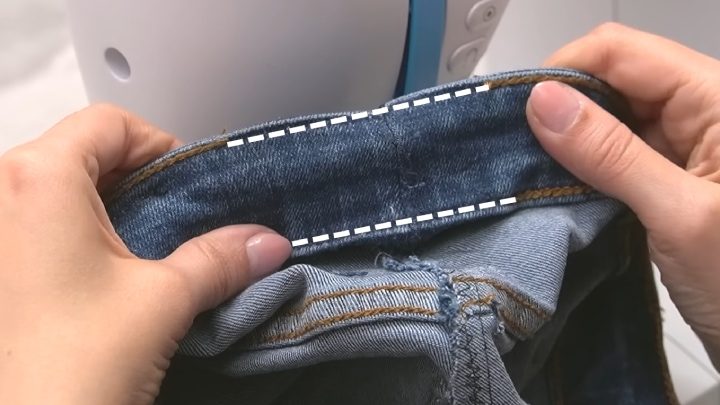 Выверните на лицевую сторону. Прошейте по этому же шву ещё раз простой строчкой. Выверните пояс наизнанку, прошейте, растянув джинсовую ткань.