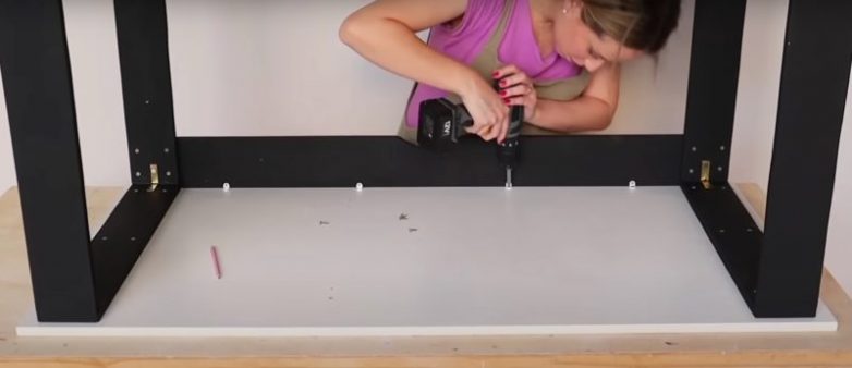 Из листа МДФ вырежьте новую заднюю стенку необходимого размера и закрепите ее на задней части стола с выдвижными ящиками.