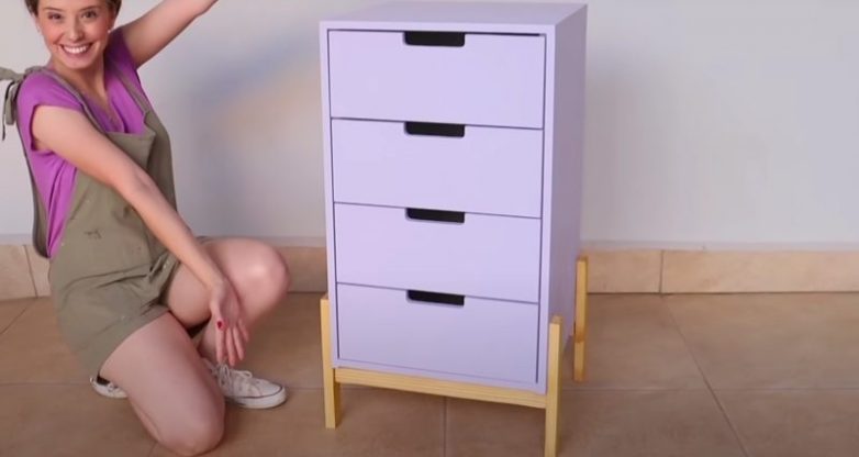 Закрепите коротки ножки по четырем сторонам комода. Между короткими ножками в горизонтальном положении закрепите более длинные планки, и работа по изготовлению современного комода будет завершена.