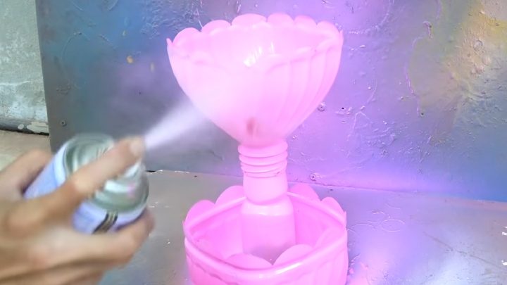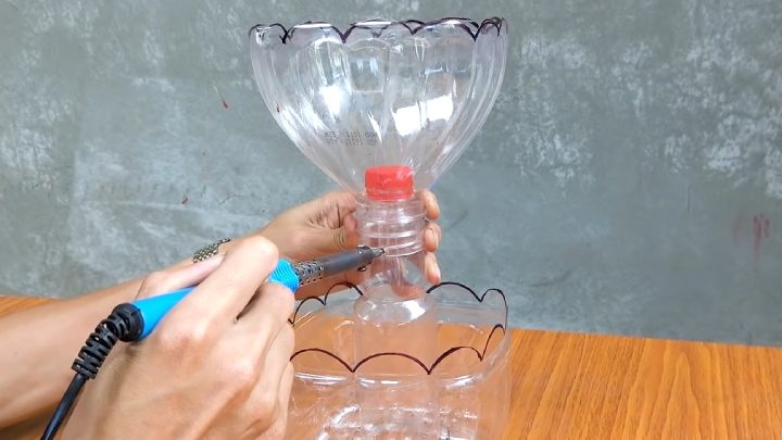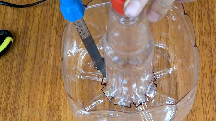 Теперь нужно припаять маленькую бутылку к дну 5 л бутылки.