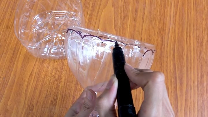 Возьмите маленькую бутылку 0,5 или 0,25, отрежьте дно. По краю сделайте насечки.