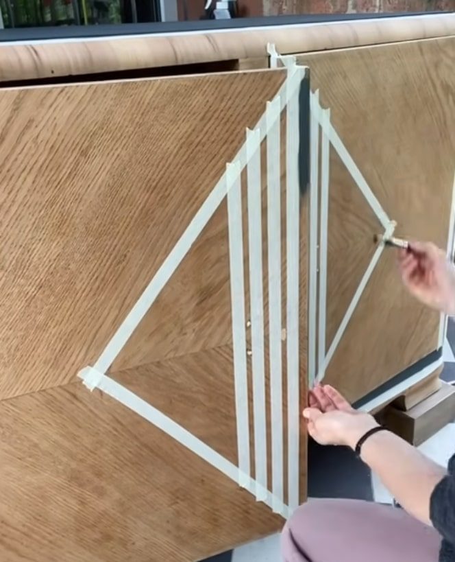 Верх (столешницу) комода покрасьте в желаемый цвет. Чтобы преобразить внешний вид, нарисуйте узор с помощью краски и малярного скотча.