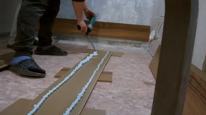 Ряд за рядом выкладывайте и приклеивайте ламинат к стене. Не забудьте про отверстия для подрозетников, если в этом есть необходимость.