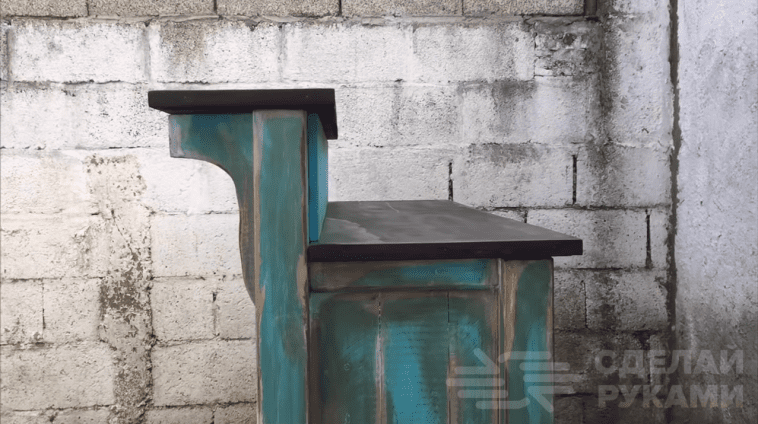 Поэтому лучше подобрать доски хоть с каким-нибудь рисунком на поверхности. Для этого вполне подойдут старые деревянные поддоны. Первым делом из досок сбиваем два небольших щита, а потом соединяем их с брусками. В результате получатся стойки для установки на них столешницы.