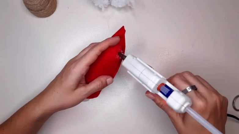 К верхней части второй крышки приклейте прямоугольник, вырезанный из тонкого красного фетра. Набейте ткань наполнителем, края скрепите с помощью горячего клея. Согните верхнюю часть заготовки, чтобы получить шапочку-колпачок.