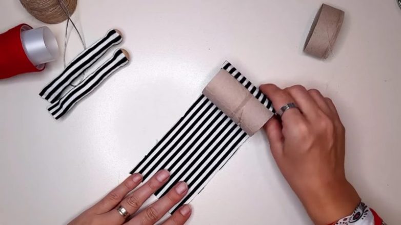 Туловище гномика будет изготовлено из картонной втулки. Срежьте 1/4 часть картонной втулки. Большую часть обклейте тканью.
