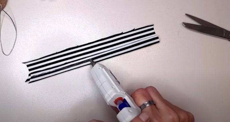 Разрежьте деталь пополам, на концах с помощью горячего клея закрепите по деревянной бусине. Второй конец заклейте.