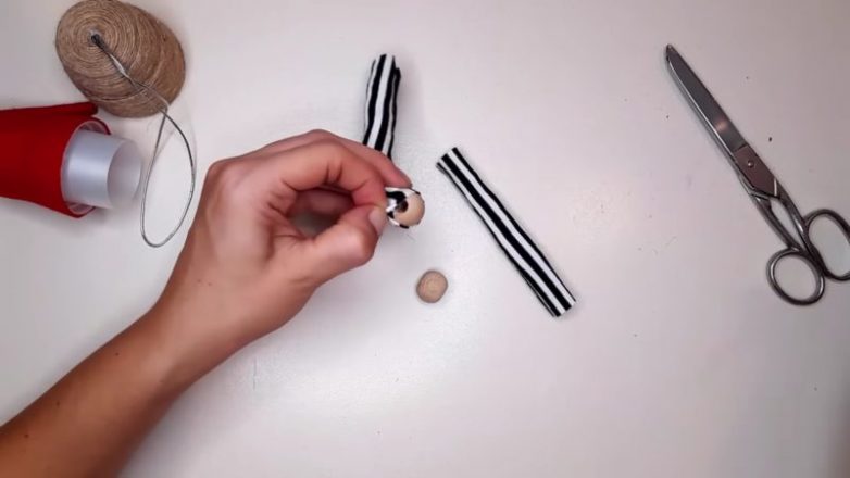 Соедините колпачок с фигуркой гномика с помощью веревочек. Чудесный гномик станет главным украшением новогодней елки.
