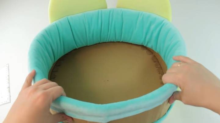 То же самое повторите и с основанием лежанки. Оберните и приклейте синтепон, а сверху — ткань. Приклейте ушки.