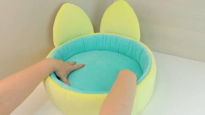 Также сделайте мягкую подушку для внутренней части лежанки. Для этого вырежьте круг по диаметру дна, приклейте синтепон и ткань. Вклейте внутрь.