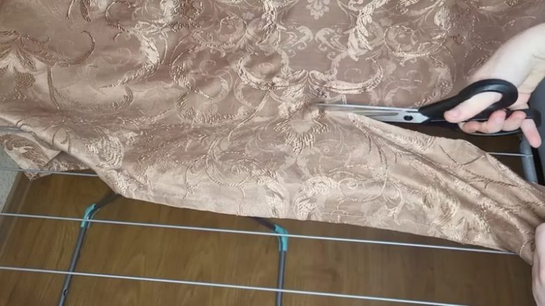 Подставьте к окну сушилку для белья. Аккуратно расправьте на ней штору и срежьте излишки ткани.