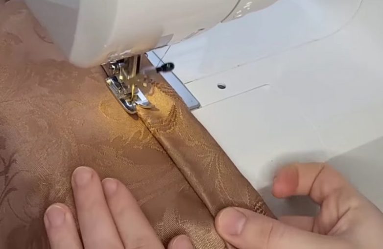 На приставной столик или подоконник поставьте швейную машину. Дважды отверните подгибку на изнаночную сторону и проложите фиксирующую строчку.