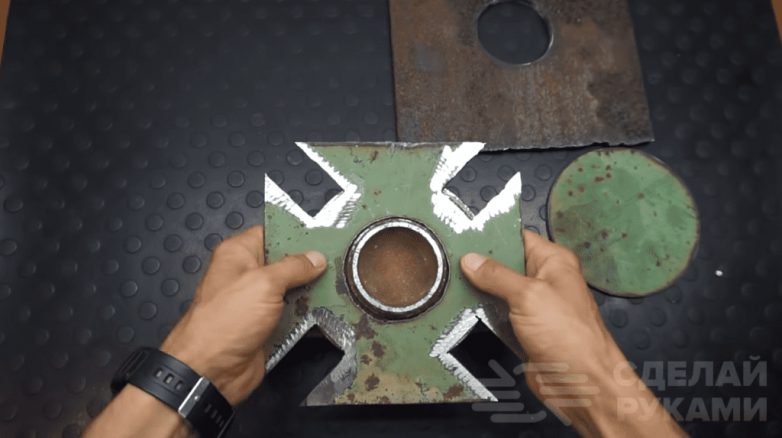 На последнем этапе работ из листа металла толщиной 8 мм делаем основание под нижнюю часть ступицы, а сверху крепим накладку и прижимную пластину. Затем «садим» ступицу по центру деревянного круга и дополнительно усиливаем трубами 20х40 мм.