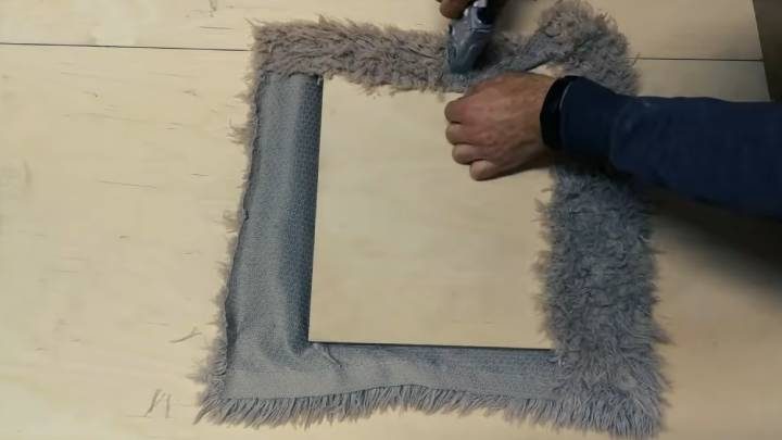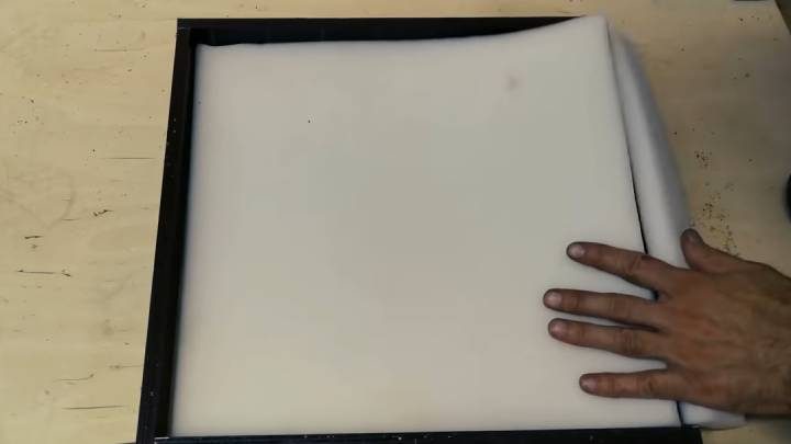 Фанеру распилите на части 40*40 см (2 шт.) и 30*30 см (1 шт.). На фанеру положите кусок поролона по размеру, приклейте горячим клеем.
