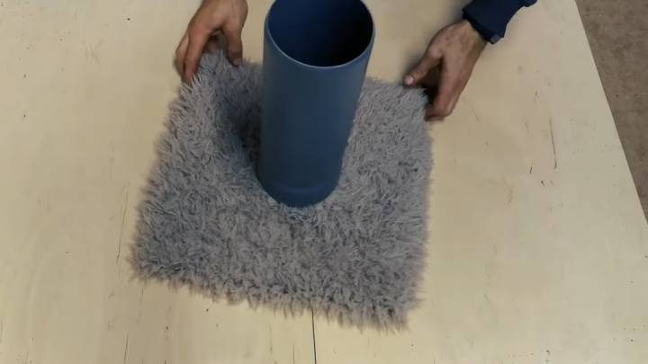 Сверху оберните искусственным мехом, зафиксируйте мебельным степлером. У труб ПВХ отпилите ободок.