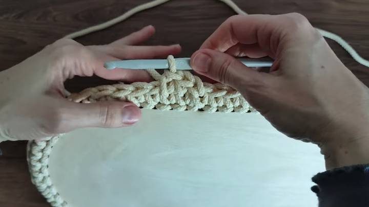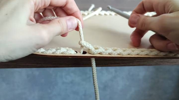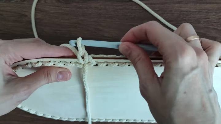 Сначала вяжется база, потом — первый ряд. Отмерьте примерно 50 см шнура — это хвостик. Он понадобится для того, чтобы с его помощью закрывать ряды. Вытяните рабочую нить снизу вверх крючком и сделайте петлю.