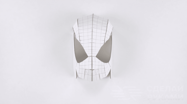 Прорези для глаз закрываем белой сеткой. На последнем этапе изготавливаем второй «слой» для маски, который скроет под собой соединительные элементы. Подробно о том, как сделать своими руками маску «человек-паука» из обычного картона, смотрите в видеоролике на сайте.